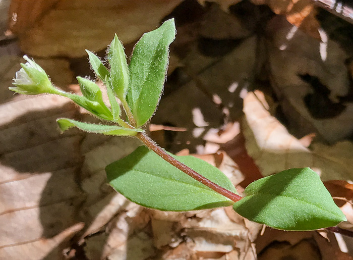 Both Stellaria corei and S. pubera have an interesting seasonal growth form, producing short and relatively small-leaved flowering shoots in the spring (which wither following fruiting), followed by taller, more vigorous summer shoots with larger and tougher leaves and lacking flowers, which persist until autumn, per Weakley's Flora (2022).