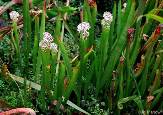 Pitchers mostly decumbent, not marked with white on the hood, per Weakley's Flora (2022).