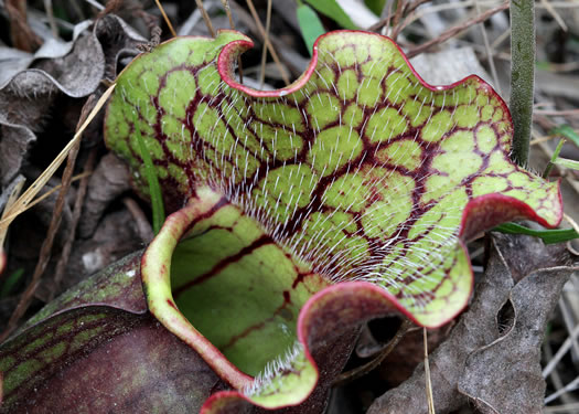 Areas of white tissue all around summit of pitcher and throughout hood, per Weakley's Flora.