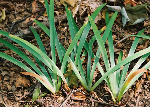 Grasslike leaves are mostly straight, to 4" long & 0.5" wide at flowering, per Wildflowers of Tennessee (Carman, 2005).