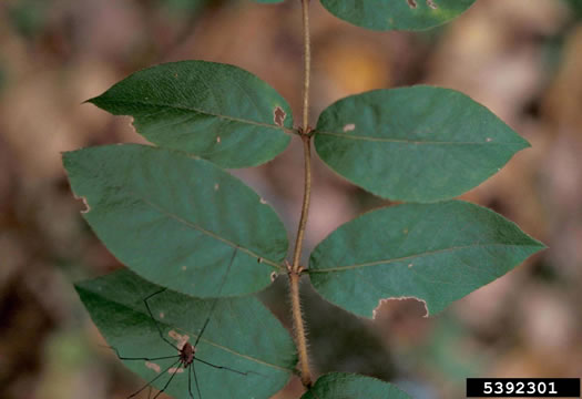 Twigs and leafstalks conspicuously hispid; leaflets relatively broad, per Weakley's Flora (2012).