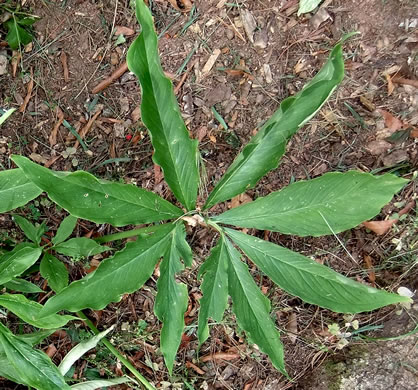 Heavily ribbed oval leaves up to 12" long, sessile or somewhat clasping, per Wildflowers of the Southern Mountains (Smith, 1998).