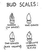 Scaled buds have one or more bud scales (which are modified leaves) to protect embryonic leaves Inside. When 2-scaled, the scales may be valvate, or meet like two cupped hands. Imbricate scales overlap at edges.