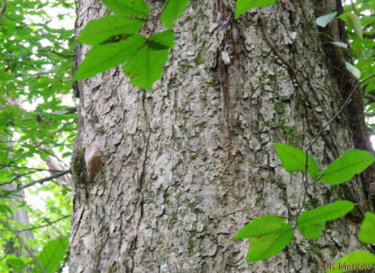 Flaky, light gray bark is very different from the dark gray, deeply furrowed bark of Q. montana, per Weakley's Flora (2022).