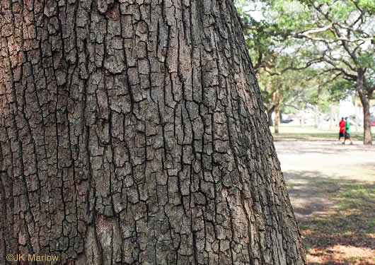 Bark thick, grayish dark brown, rough, deeply furrowed, with scaly ridges, per Native Trees of the Southeast, An Identification Guide (Kirkman, Brown, & Leopold, 2007).