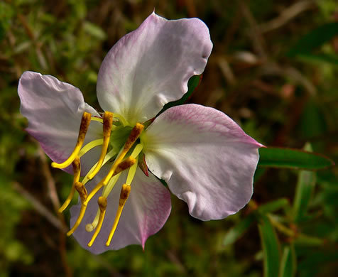 Petals pale pink (to white); stamens 8, with prominent curved yellow anthers, per Wildflowers of Tennessee (Carman, 2005).