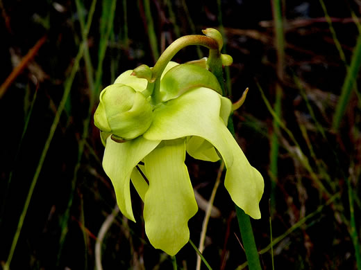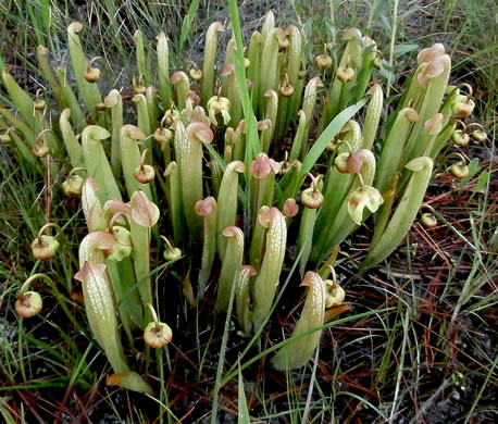 The top of Sarracenia minor's 1-foot-tall pitcher is curved from the back to produce a hood with numerous large white spots, which makes the pitcher opening almost completely covered. Read more at Vascular Plants of North Carolina.