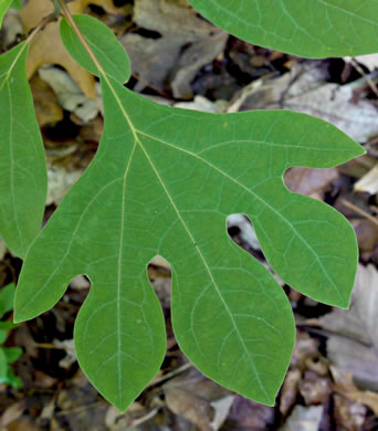 Leaves can be unlobed, mitten-shaped, or 3-lobed; margins entire, per Woody Plants of the Blue Ridge (Lance).