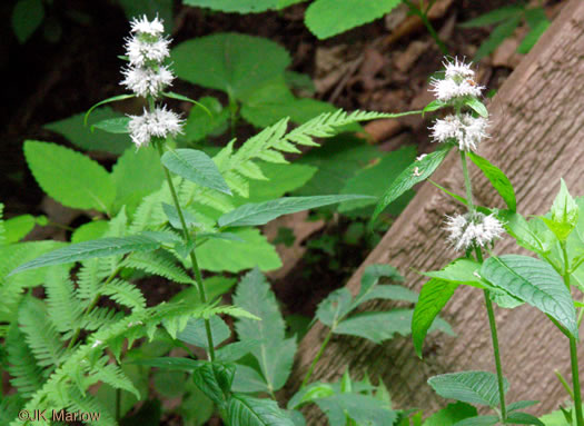 Two to six dense whorls of flowers encircle square hairy stems at intervals, per Forest Plants of the Southeast and Their Wildlife Uses (Miller & Miller, 2005).