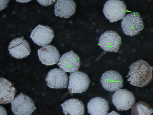 Megaspores light cream or white, reticulate, 400-600 micra in diameter, per Synopsis of Isoetes in the Southeastern United States (Boom, 1982).